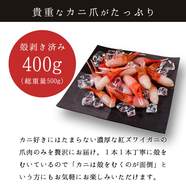 送料 0円(北海道、沖縄、その他離島へのお届けは別途600円の送料を頂戴しております) 配送温度帯 冷凍便(ヤマト運輸) 名称 冷凍茹でがに 原材料名 紅ズワイガニ(鳥取県産)、食塩 内容量 400g(総重量500g/24〜32本) 賞味期限 6カ月 ※解凍後はなるべくお早めにお召し上がりください。