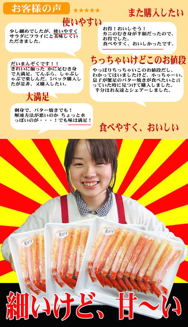 ギフトに刺身用紅ズワイ500g 送料無料 たっぷり約50本入り刺身用紅ズワイ500g×2個セット 送料無料 お届けするパックは【20本入り×3個】、 もしくは【10本入り×6個】になります ※お選びいただくことはできません